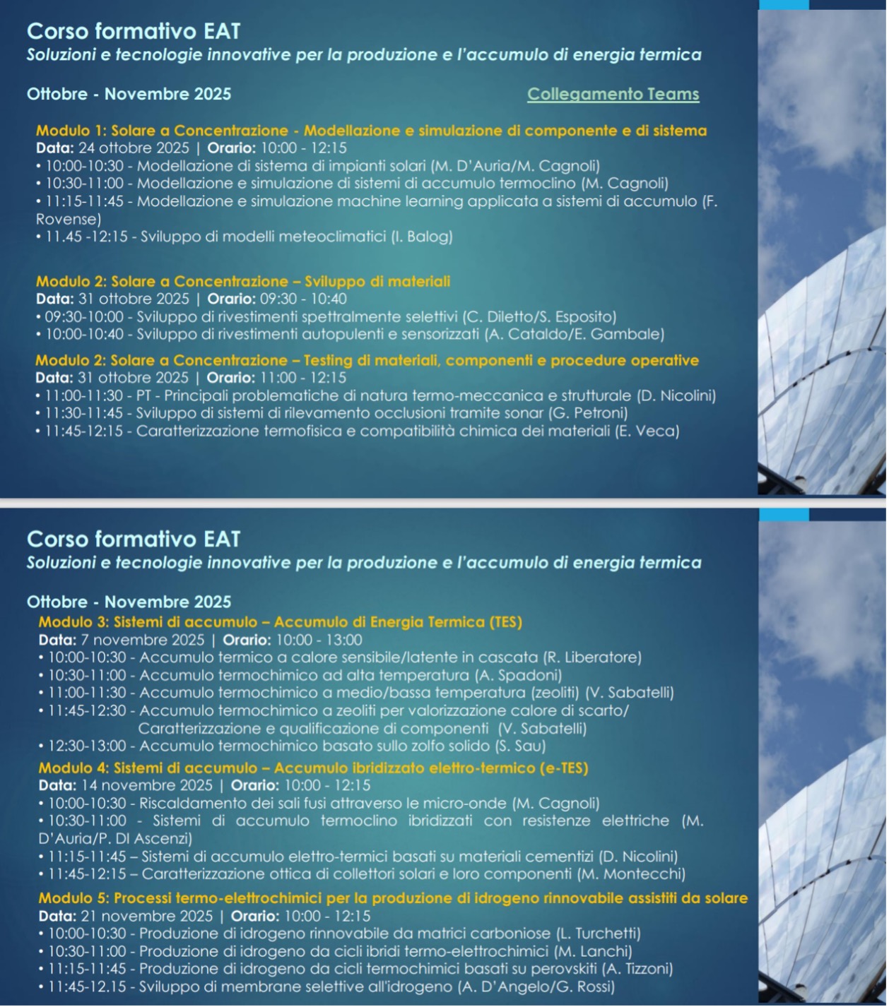 Si è concluso con successo alla fine di novembre il percorso formativo sulle “Soluzioni e tecnologie innovative per la produzione e l’accumulo di energia termica”, ideato e coordinato dall’Ing. Michela Lanchi, responsabile del laboratorio TERIN-SSI EAT. L’esercizio di mutual learning, articolato su cinque moduli formativi, ha impegnato circa 35 ricercatori ENEA del laboratorio EAT, che hanno condiviso know-how ed esperienze di ricerca anche con i colleghi degli altri laboratori della divisione SSI (Divisione Smart Sector Integration e generazione distribuita da FER).