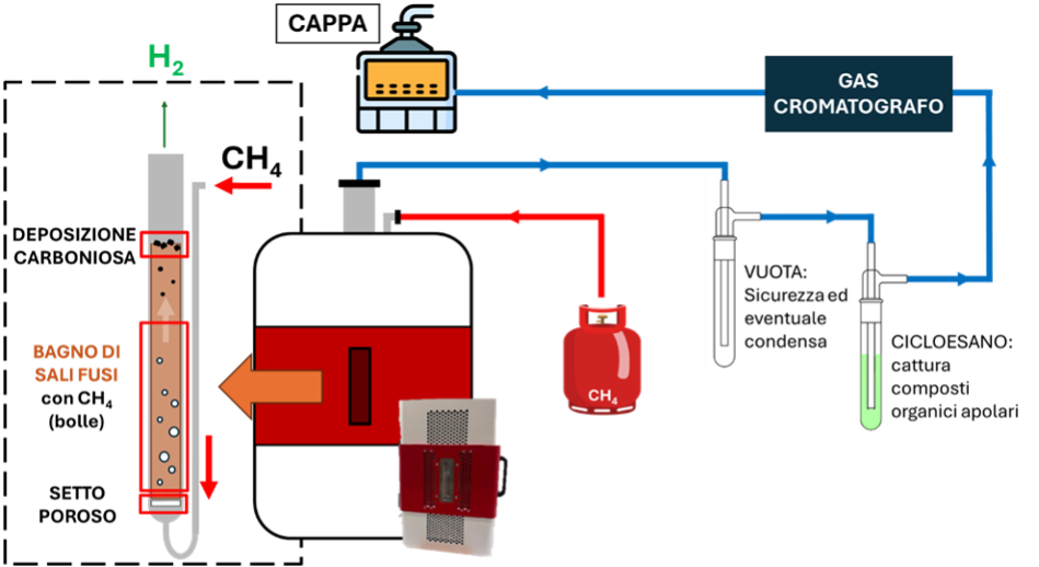 In una fase successiva verranno effettuate le campagne sperimentali per l’analisi prestazionali del sistema: test di pirolisi del metano e del biogas in condizioni controllate, analisi in continuo della conversione in idrogeno e scelta delle miscele più promettenti.