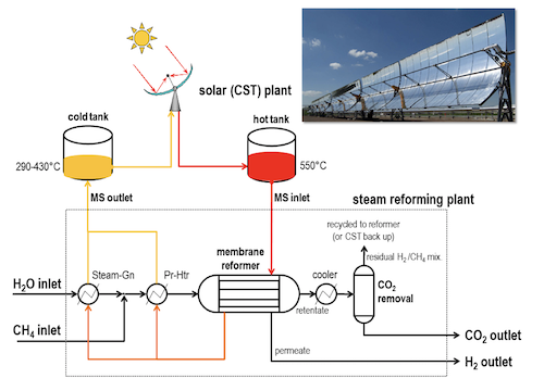 Un comune impianto solare a concentrazione provvede alla captazione e al trasferimento dell’energia solare attraverso sali fusi, ovvero una miscela di nitrati di sodio e potassio (60% NaNO3, 40% KNO3). Il sistema di stoccaggio di calore con doppio serbatoio consente di stabilizzare l’input termico all’impianto chimico, indipendentemente dalle fluttuazioni della radiazione solare. I sali fusi a una temperatura nominale di 550°C vengono in primo luogo inviati al reattore di steam reforming costituito da uno scambiatore di calore a fascio tubiero e mantello: i sali fusi, dal mantello dello scambiatore, trasferiscono il loro calore ai tubi in cui avviene la reazione di produzione di idrogeno. I tubi contengono, infatti, un apposito catalizzatore per la reazione di steam reforming e una membrana a base di palladio che consente di estrarre l’idrogeno prodotto. L’estrazione di idrogeno dall’ambiente di reazione consente, in un singolo stadio, sia di ottenere elevate rese (nonostante temperature relativamente “basse” per tale processo) che di purificare l’idrogeno prodotto. Dal reattore uscirà, quindi, idrogeno puro (> 99%) e una miscela gassosa ricca in CO2 che potrà essere facilmente purificata. Il calore residuo dei sali fusi provenienti dal reattore viene utilizzato per sostenere altri servizi di impianto (preriscaldamento alimentazione, generazione di vapore, ecc.); i sali fusi sono, infine, raccolti nel serbatoio “freddo” dell’impianto solare.