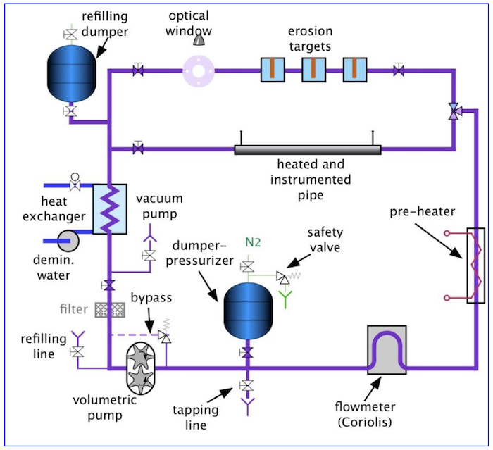 La facility è stata realizzata inizialmente per lo studio sperimentale dell’affidabilità dei nanofluidi nelle applicazioni industriali. L’impianto permette di effettuare la misura e il confronto diretto dello scambio termico tra fluidi differenti in monofase, mentre una seconda linea, alternativa, è dedicata allo studio dell’erosione/corrosione e abrasione. Sottoponendo i componenti al flusso continuo dei due fluidi per tempi lunghi (anche settimane) in condizioni stazionarie, si può misurare il danneggiamento della superficie e la variazione delle caratteristiche del fluido, correlandole alle condizioni fisiche della prova (tipo di particelle e loro concentrazione, velocità di impatto, temperatura).