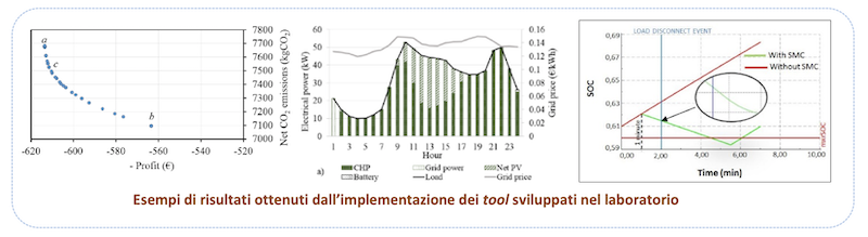 - Sviluppo ed implementazione di strategie multi-obiettivo, in relazione alle diverse richieste di fornitura di servizi energetici, per la gestione ed il controllo di microreti energetiche in configurazione Smart Grid in presenza di generazione distribuita da FER