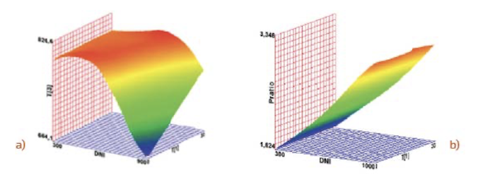 Parametri operativi del sistema al variare delle condizioni ambientali (DNI e temperatura). a) Temperatura di ingresso in turbina [°C]; b) Rapporto di compressione