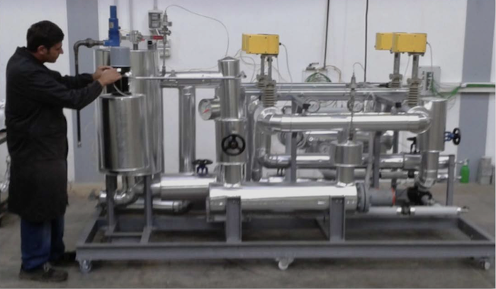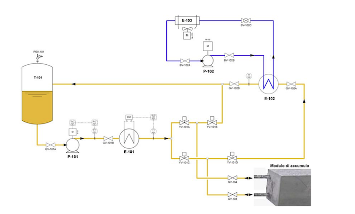 L’impianto è dotato di tutti i componenti necessari per poter effettuare prove sperimentali di caratterizzazione di sistemi solidi di accumulo, come mostrato nello schema semplificato. Il range operativo di portata è compreso tra 0 a 1.000 kg/h. Lo scambiatore di calore elettrico E-101, con potenza di 21 kWt, consente di riscaldare l’olio in ingresso al modulo di accumulo al valore desiderato di temperatura; il controllo della potenza elettrica è effettuato sulla base della temperatura dell’olio in uscita dal componente. Lo scambiatore di calore E-102, consente, invece, di raffreddare l’olio all’uscita del modulo di accumulo al valore richiesto di temperatura.