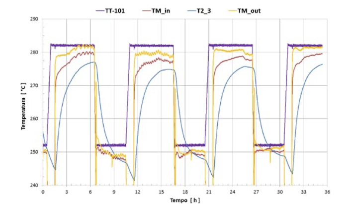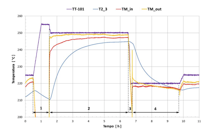 Di seguito sono rappresentate le quattro fasi operative caratteristiche del sistema: il riscaldamento dell’olio presente nel circuito alla temperatura di prova (1), la successiva fase di caricamento con il trasferimento dell’energia termica dall’olio al modulo, fino al raggiungimento di condizioni stazionarie (2), il raffreddamento dell’olio fino alla temperatura di prova (3), e lo scaricamento del modulo con il trasferimento dell’energia termica all’olio, che è dissipata nello scambiatore di calore (4). Il tempo necessario per l’esecuzione di una prova completa è di circa 10 ore. Le prove sono ripetute ciclicamente per analizzare l’eventuale degrado delle prestazioni del modulo nel tempo. Nella figura seguente sono mostrati i risultati di una prova in cui sono stati eseguiti in sequenza tre cicli completi.